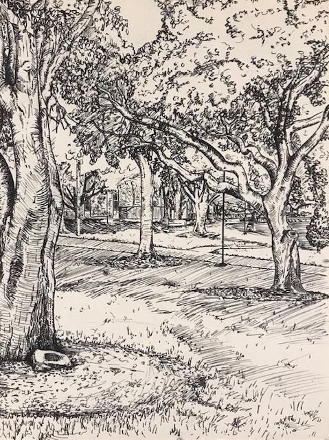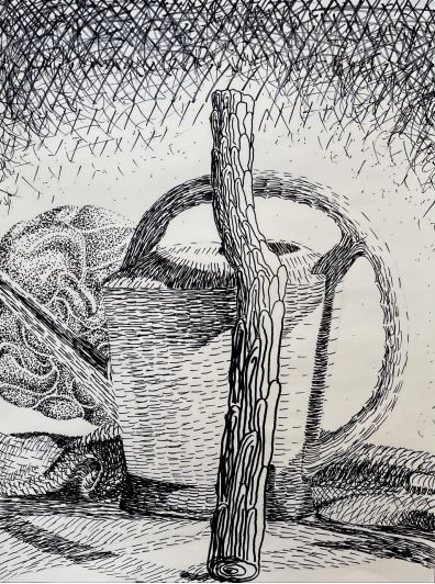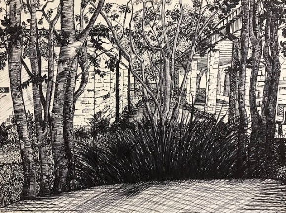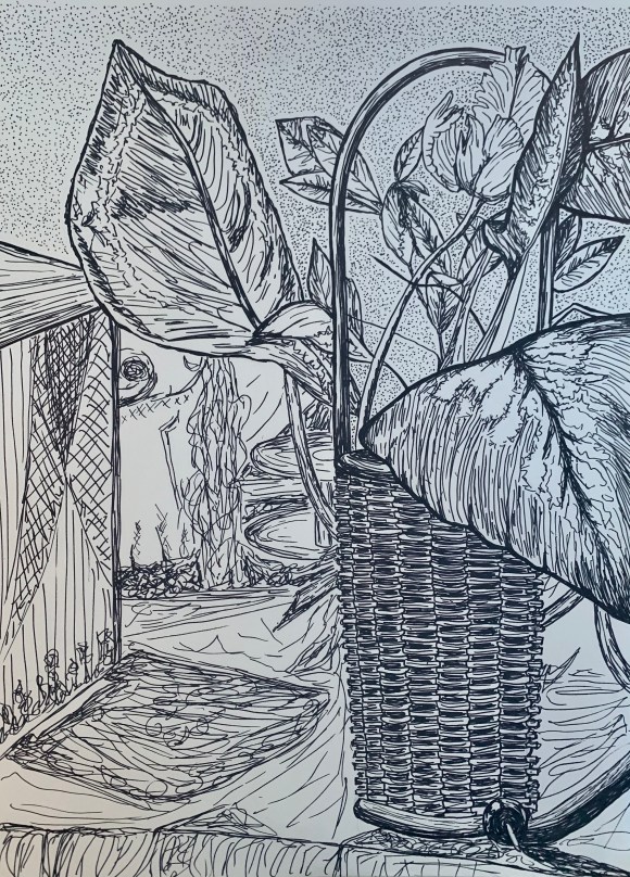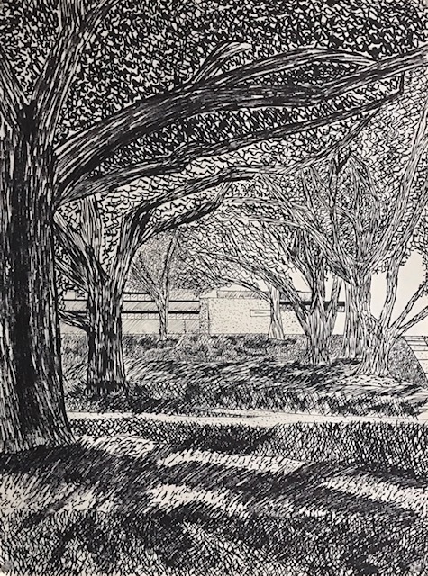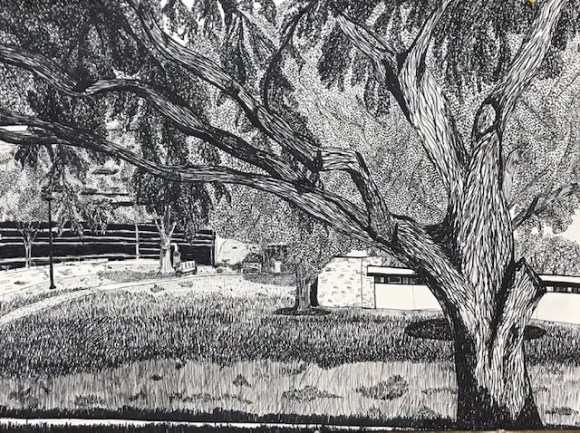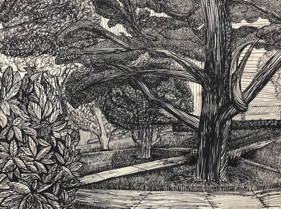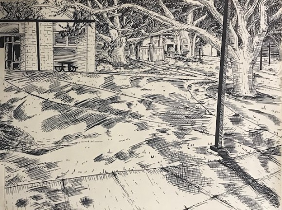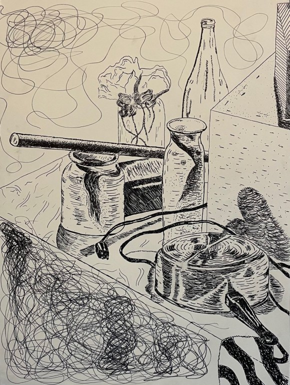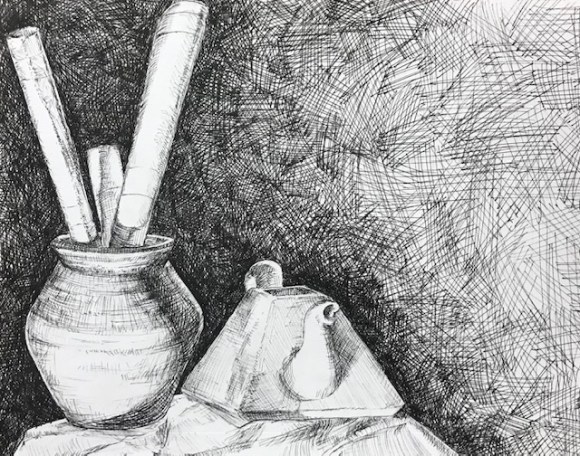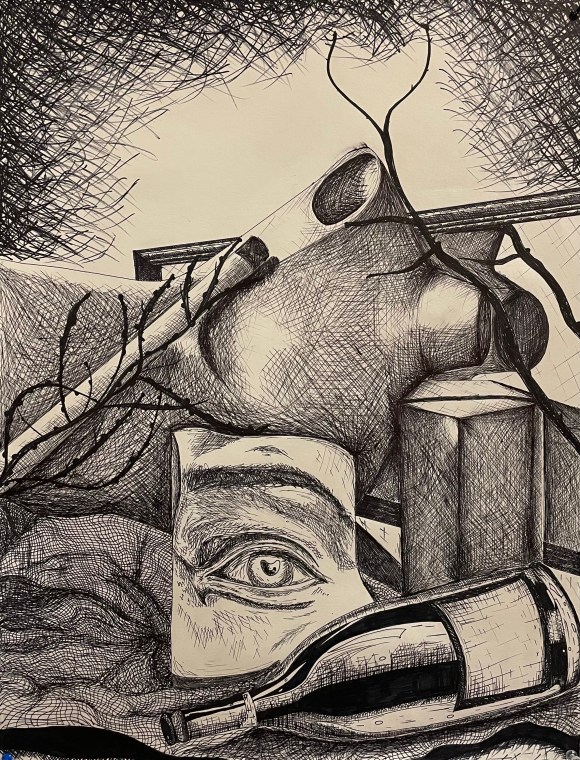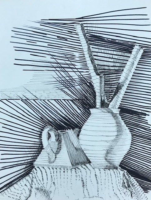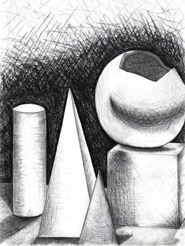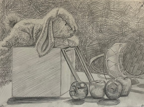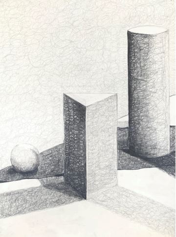 Drawing students create an expressive drawing from direct observation using compositional strategy, diminishing detail, diminishing value-range, and varying the weight, value, and texture of their marks to illustrate the direction of the light and the spatial sequencing of objects.
