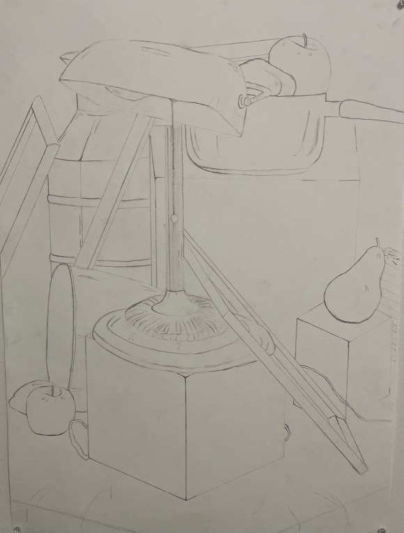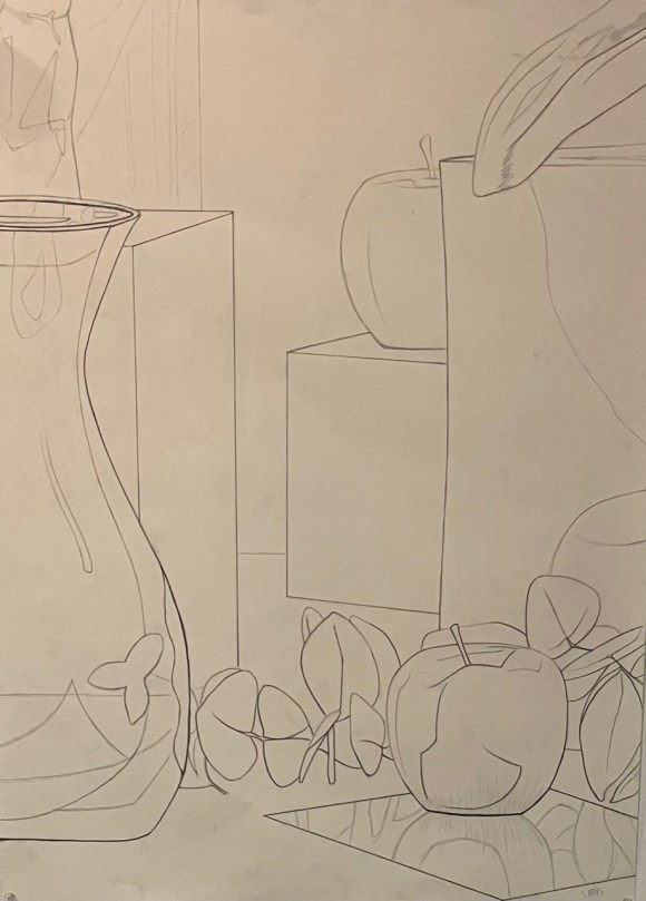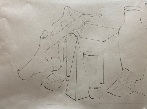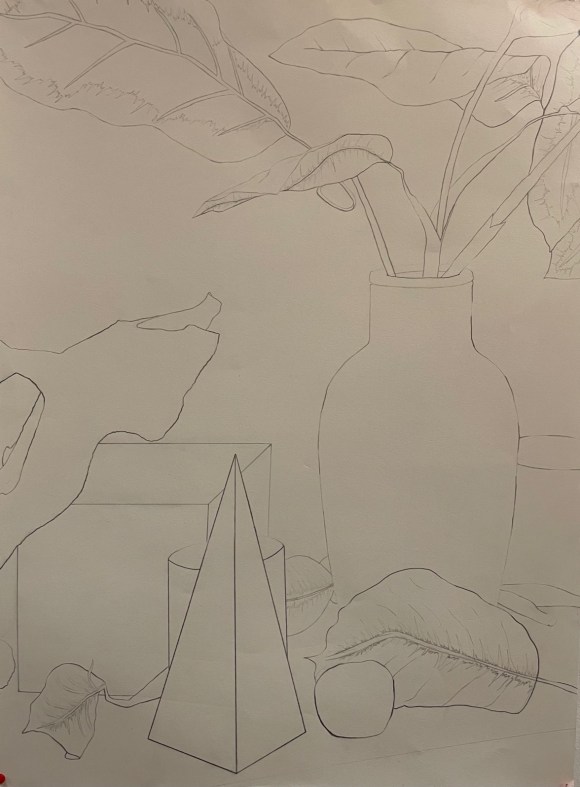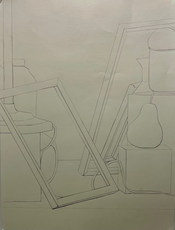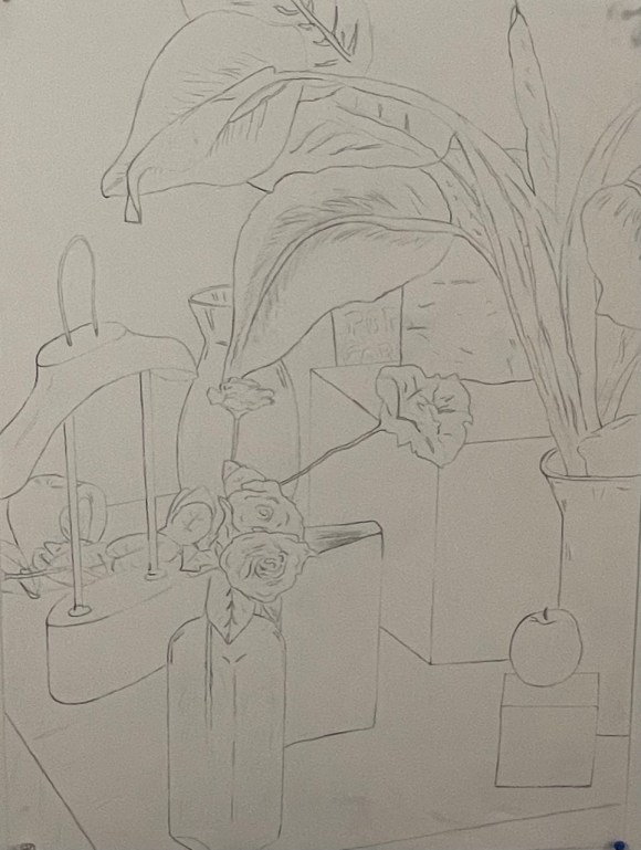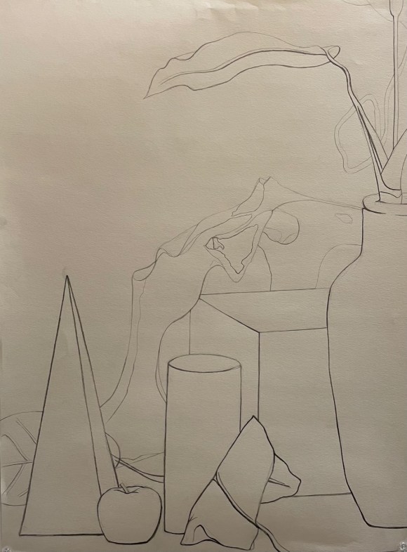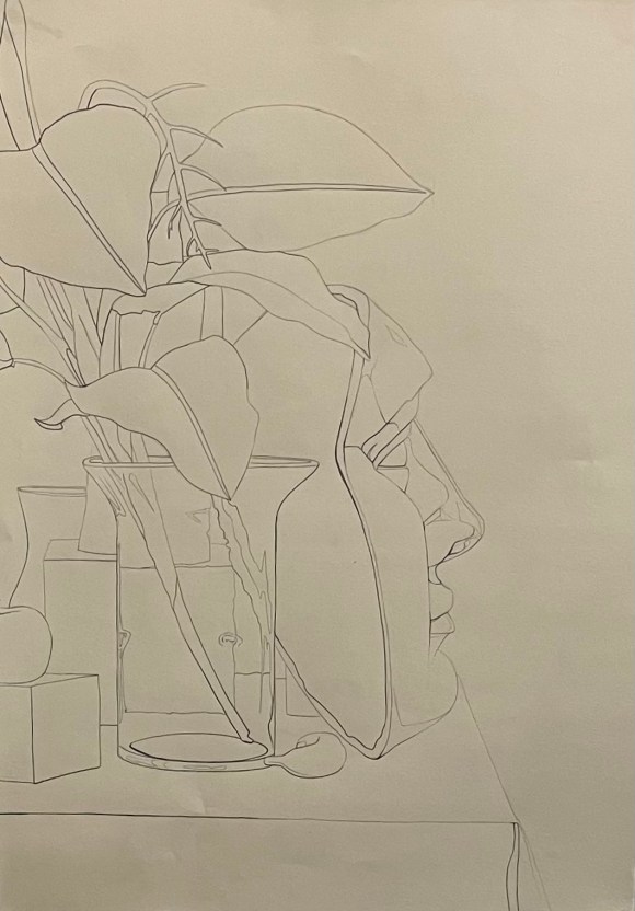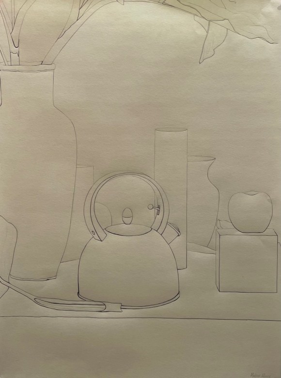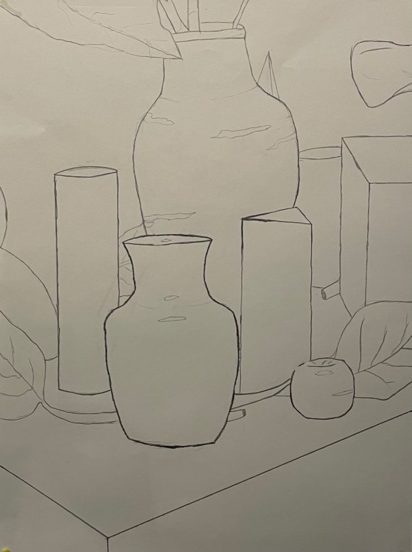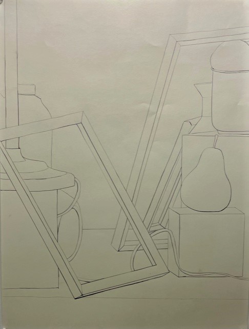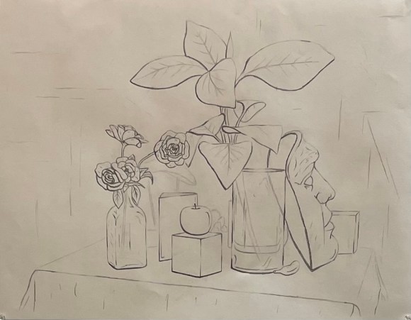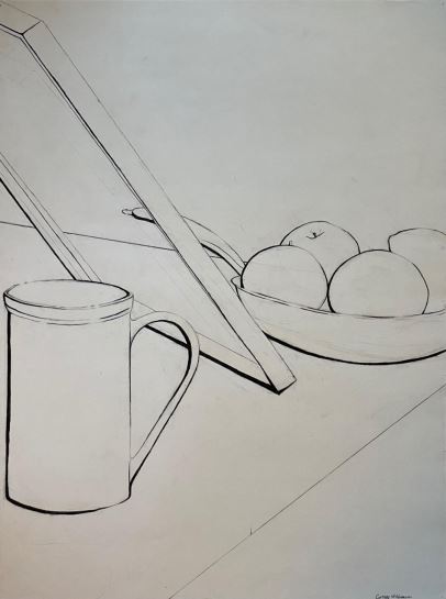 Drawing students create a contour line drawing of a still life from direct observation, varying the weight, value, and texture of their lines to illustrate the direction of the light and the spatial sequencing of objects.